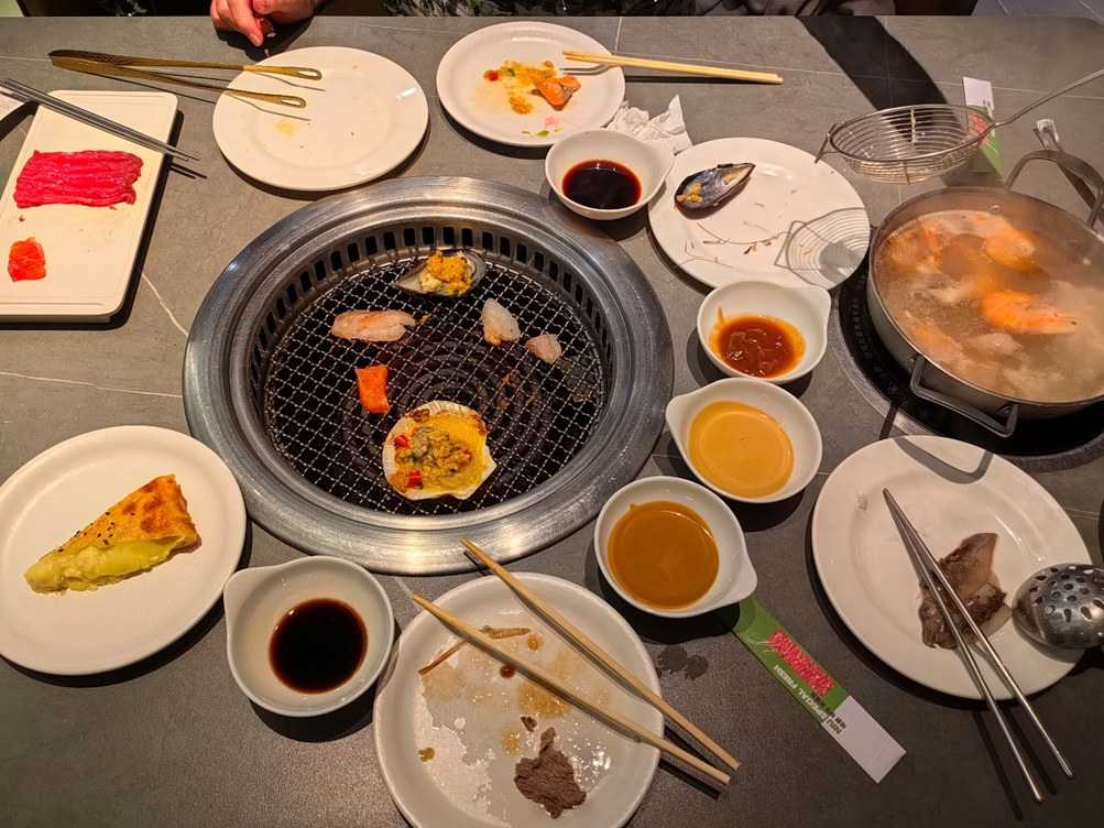 Eat as much as you can for 160 CNY (19 EUR) Beef, pork, lamb, chicken, duck, fish, crab, whatever you can imagine. Fruit, cake, ice-cream, chocolate, … Beer, spirit, fresh fruit juice, coffee, tea, …
