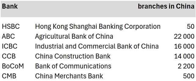 In vergelijking met de grote Chinese banken is de aanwezigheid van HSBC op het Chinese vasteland verwaarloosbaar: